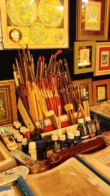 Traditional calligraphy tools include brushes, nib pens, and ink, which have been used for centuries to create intricate designs. Brushes, often made from animal hair, are essential for styles like Chinese calligraphy, offering expressive line variations. Nib pens, with interchangeable tips, allow for precise lettering and flourishes. Ink, derived from natural sources, ensures vibrant and durable results. These tools require skill and patience, making calligraphy a meditative art form. PDF resources, such as the Chinese_Calligraphy_Collection.pdf, often include tutorials on using these traditional tools effectively.