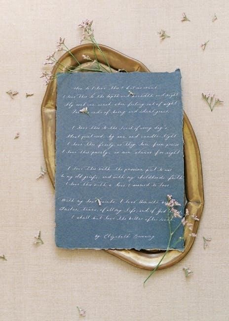 Calligraphy adds elegance to wedding invitations and cards, making them visually stunning and emotionally impactful. Decorative handwriting is often used to highlight names, dates, and venues, creating a timeless aesthetic. PDF formats allow for precise design control, ensuring consistency and beauty in printed materials. Many designers use calligraphy PDF templates to craft bespoke wedding stationery, blending tradition with modern digital tools. This art form elevates the overall wedding experience, making it a popular choice for couples seeking sophistication and personalization in their celebrations.